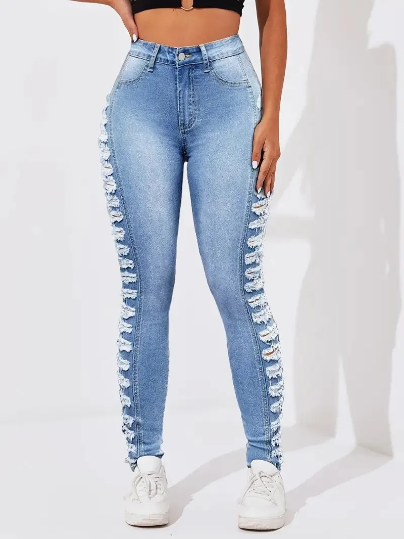 Women's fashionable washing light blue side layered ripped elastic slim fit and hip-retracted casual nine-point foot jeans